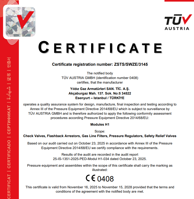 Yildiz Gas manufactures every product to strict safety benchmarks. Independent inspectors from TÜV AUSTRIA audit our production facilities. This oversight confirms that our pressure regulators, flashback arrestors, and valves meet rigorous quality requirements. We test our equipment to prove it performs reliably in industrial settings. You can trust our certified engineering for your gas control systems.